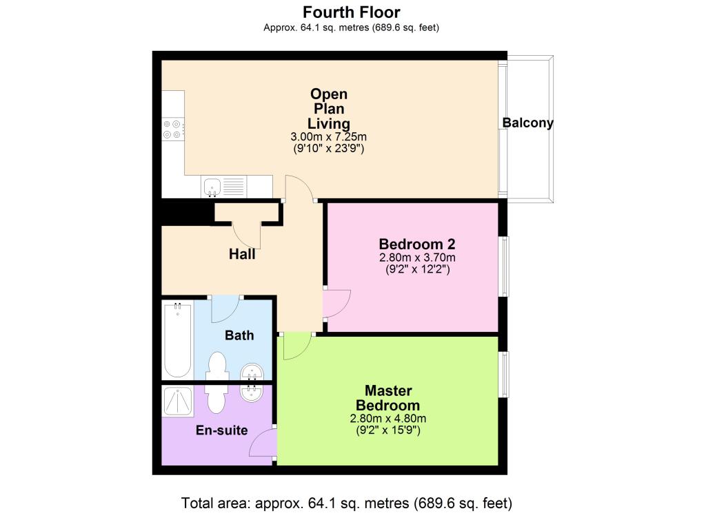 This well presented 2 bedroom apartment benefits from an large open plan kitchen/living area leading to the spacious balcony. The largest of the two bedroom is generous and provides ample storage. The modern white en-suit includes a large mirror, WC, wash basin and large shower cubicle. The second bedroom again offers ample space and could be used as a second bedroom or study. There is enough space for a double bed, wardrobe and desk. The family modern white bathroom includes WC, wash basin and bath/shower. Just across the hall a large airing cupboard adding extra storage where needed.