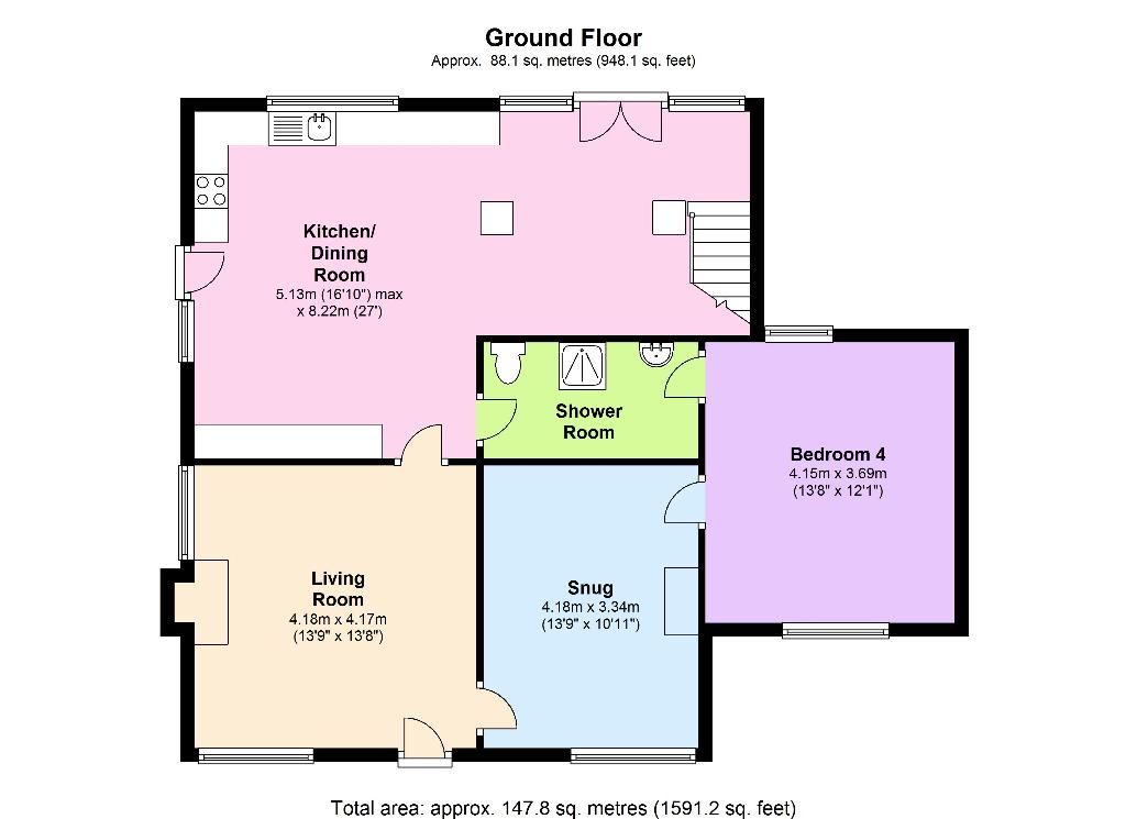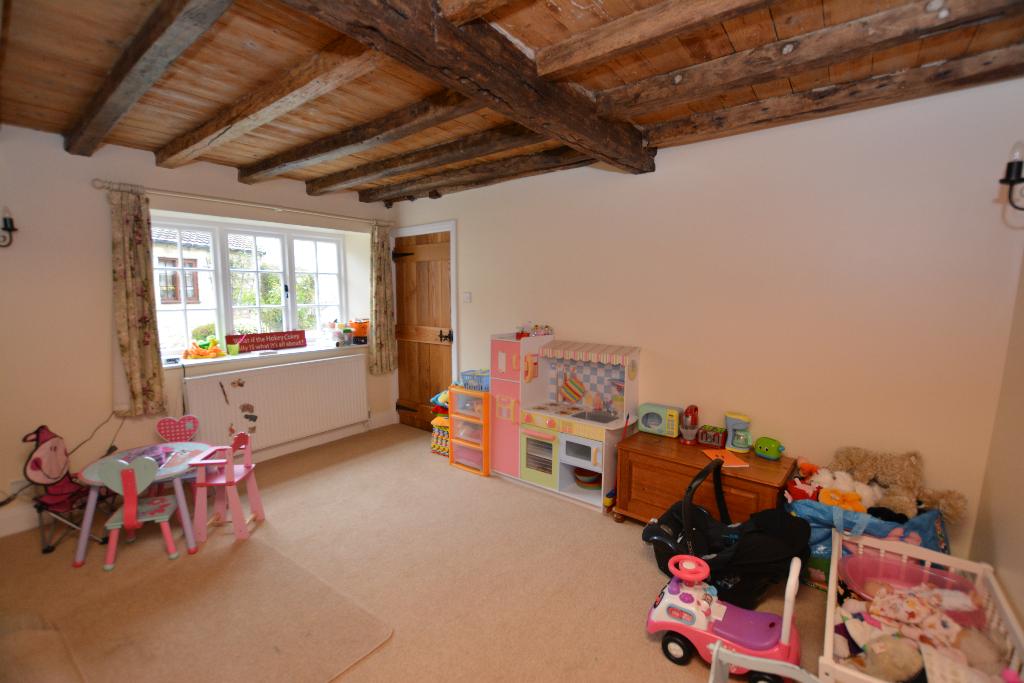 The wooden cottage-style front door leads to the Living Room with original ceiling wooden beams, a lovely log burner and a cosy window seat. Door leading through to a further Snug reception room with a fireplace. Spacious open plan Kitchen Dining Room with tiled flooring and spotlights, the fully fitted Kitchen includes a dishwasher, oven, hob, fridge and freezer. Space for own washing machine. Both a side door with external roofed porch leading to the driveway, and attractive patio doors facing out onto the rear gardens. Downstairs also encompasses a modern Shower Room and a large Double Bedroom with original ceiling wooden beams.