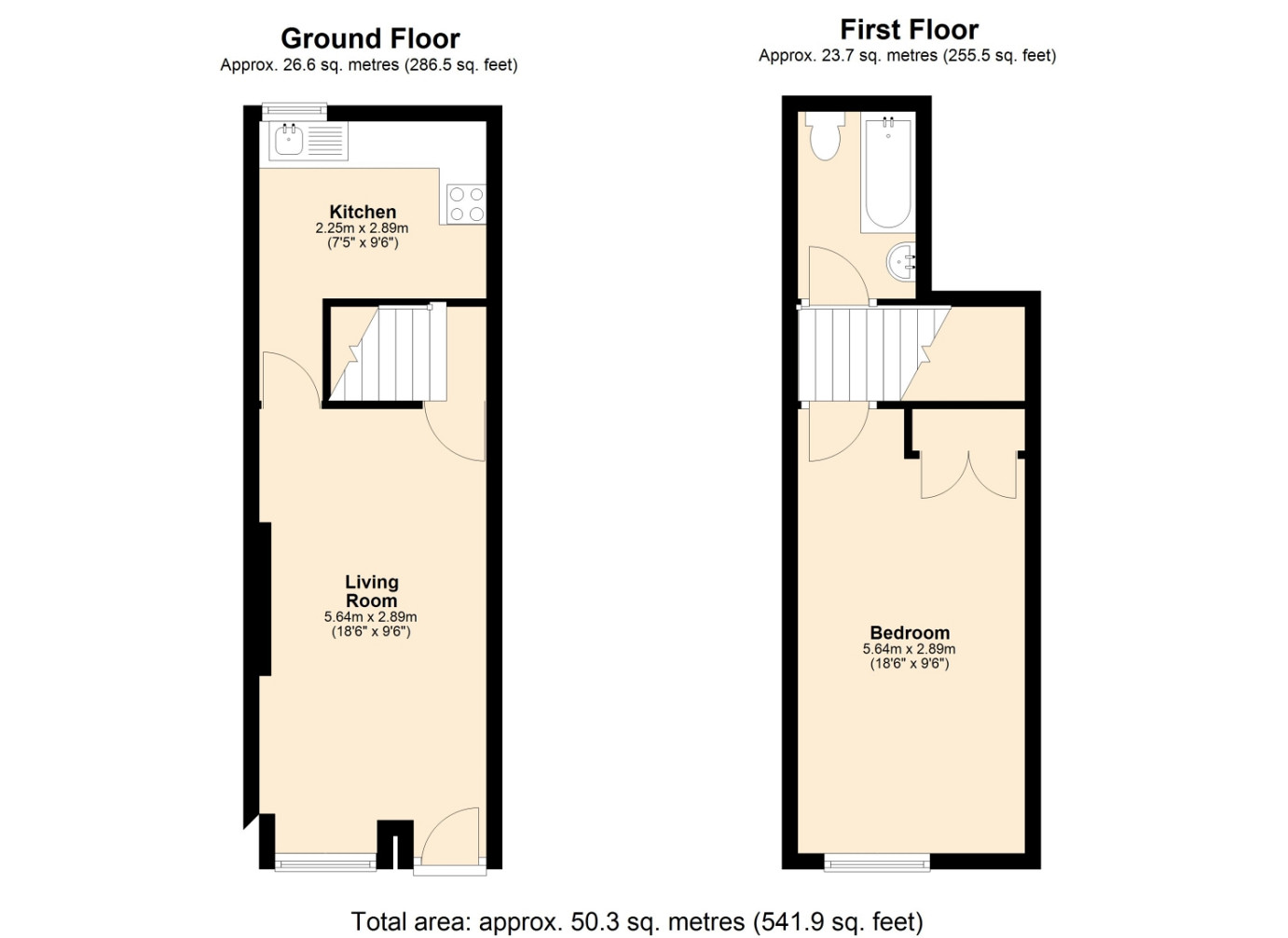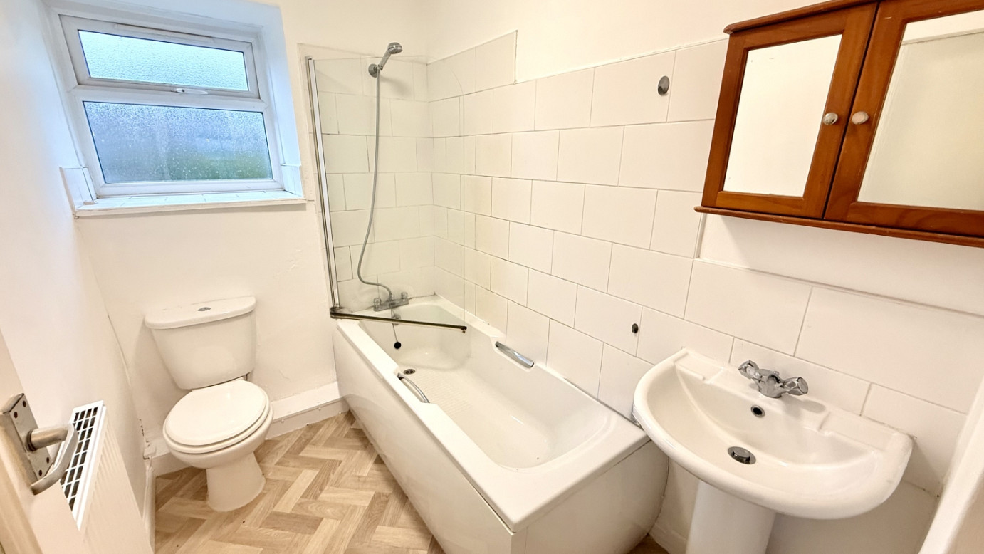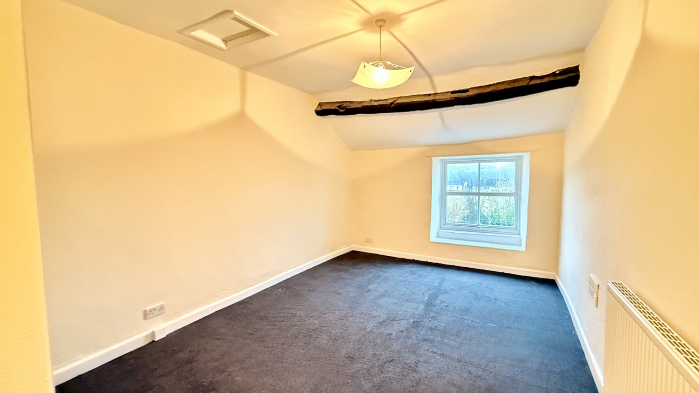 Stairs lead to the first floor, where there is a large double bedroom with ample space for bedroom furniture. The bathroom is also located upstairs and includes a bath with a stand-up shower.