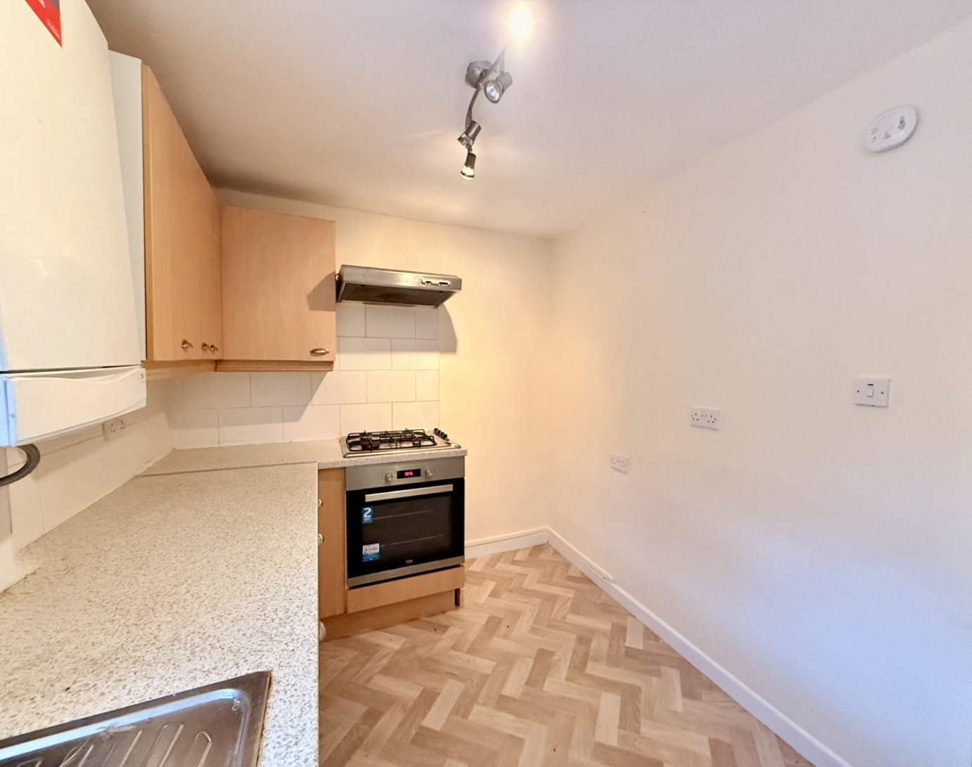 The property opens into the lounge, which features exposed ceiling beams and a stone fireplace with gas fire. The room is well-proportioned and benefits from double-glazed windows, gas central heating, and a practical layout for living and dining. Leading through to the kitchen, which is fitted with a gas hob and oven and a space for a washing machine.