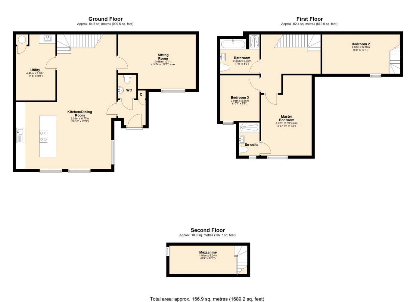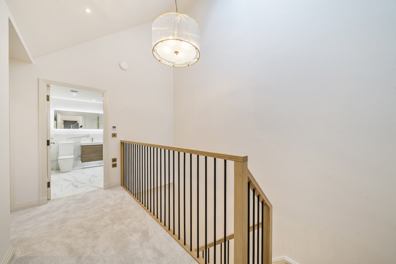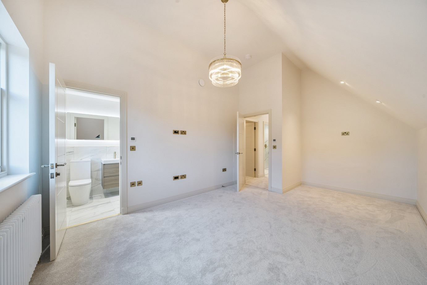 Upstairs, three well-proportioned double bedrooms include a main suite with vaulted ceilings and a luxurious en-suite shower room with contemporary fixtures. Two further double bedrooms are served by a stunning main bathroom, finished to an exceptional standard with marble-effect tiling, gold fittings, a rainfall shower, and a full-sized bath.