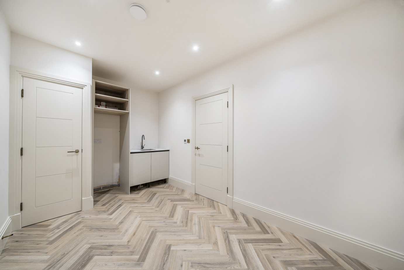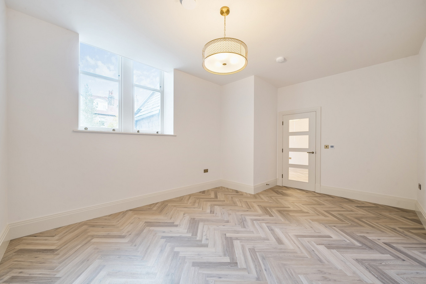 At the heart of the home is a spacious, light-filled open-plan kitchen and dining area, complete with integrated NEFF appliances (including a wine fridge), sleek cabinetry, and a large central island ideal for entertaining. Herringbone flooring flows throughout the ground floor, leading into a generous sitting room and a large, versatile utility or hobby room.
